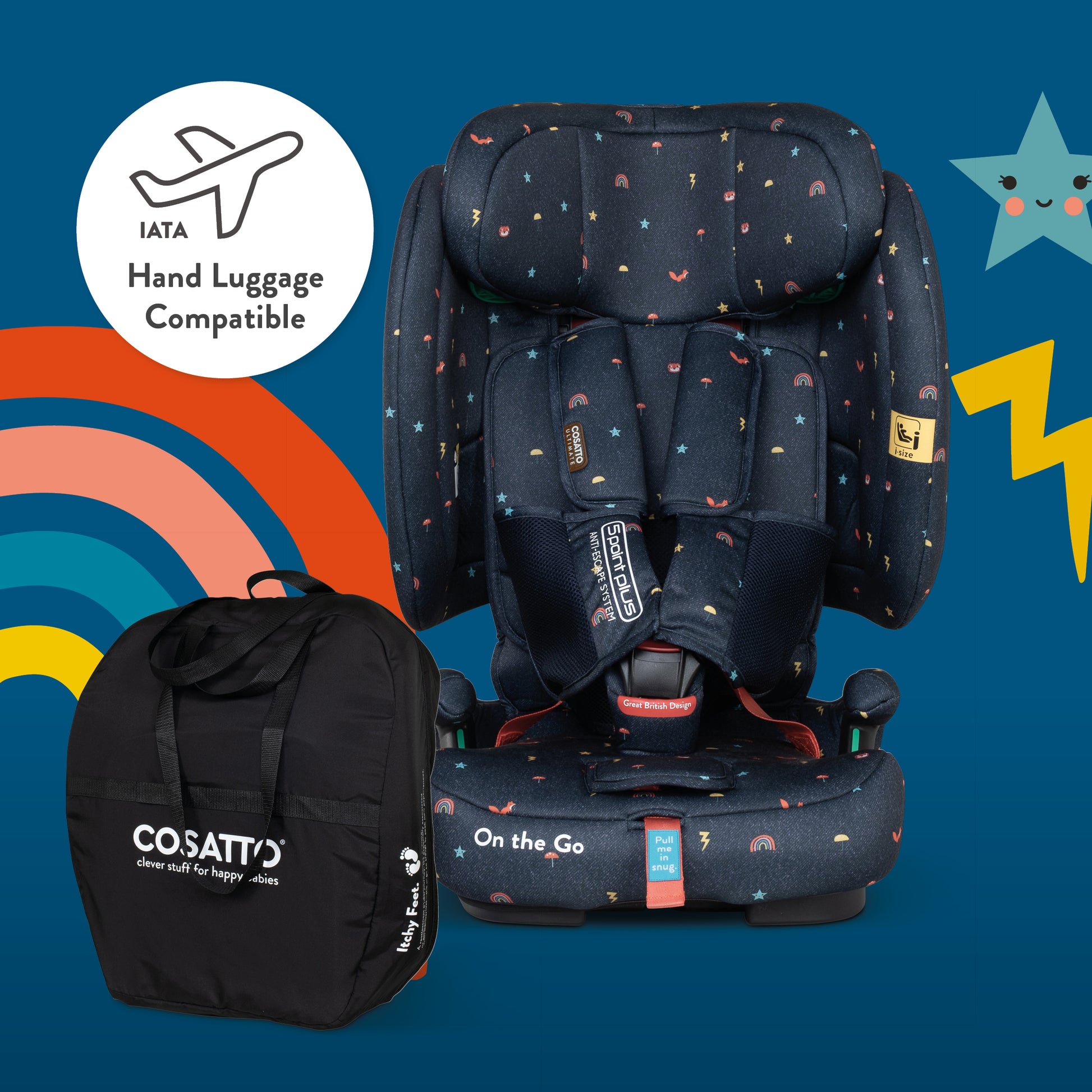 The first of its kind, from vacation to staycation, keep your precious passenger safe wherever your adventures take you with Cosatto On the Go i-Size travel car seat. It’s the ultra-compact, airline luggage compatible seat that folds into its own handy carry bag. From grandparents to grand tours, On the Go’s compact fold is car boot friendly, under-stairs friendly and luggage friendly. Plus, this market-leader protects them for even longer, taking your child all the way from 76cm (minimum 15 months) to 150cm (approx. 12 years). With safety solutions including exclusive anti-escape harness with Isofix installation and built-in top tether warning system, On the Go i-Size is your ultra-portable, clever companion. Safety for jetsetters? It’s in the bag.